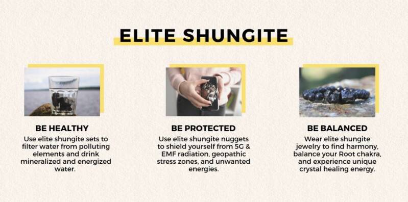 Tevens is Shungite een materiaal dat een actieve interactie aangaat met elektromagnetische velden van verschillende aard zoals geopatische straling, (aardstralen, straling uit geologische breuklijnen, radioactieve straling), zonne-energie, bio-velden (computer, dect, gsm), antropogene hoge frequenties (door de mens gemaakte hoge frequenties zoals WiFi 2.4 GHz)